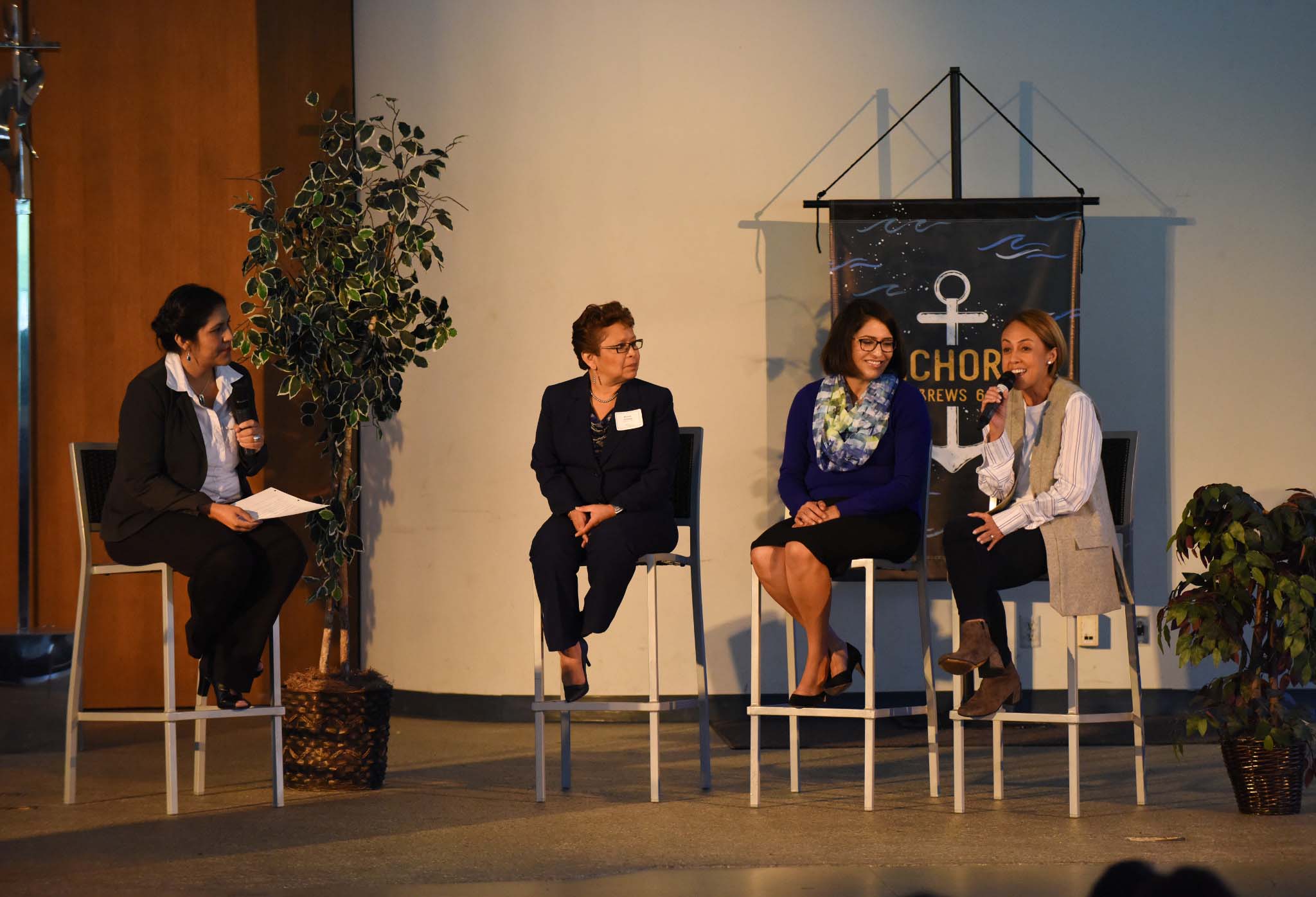 In addition to learning about college majors and how first-generation professionals are using their degrees in their careers, conference attendees also heard from three Hispanic first-generation influencers who shared about how they grew up, who influenced them, their hard work, and how taking advantage of opportunities in school and life helped to pave the road to success. Pictured from left are moderator UC Riverside Public Information Officer Sandra Martinez, Irvine High School Principal Monica Colunga, Cox Public Affairs Manager Adriana Galdamez, and record executive BMI Vice President Latin Division Delia Orjuela--all Hispanic first-generation college graduates whose parents didn't attend college.