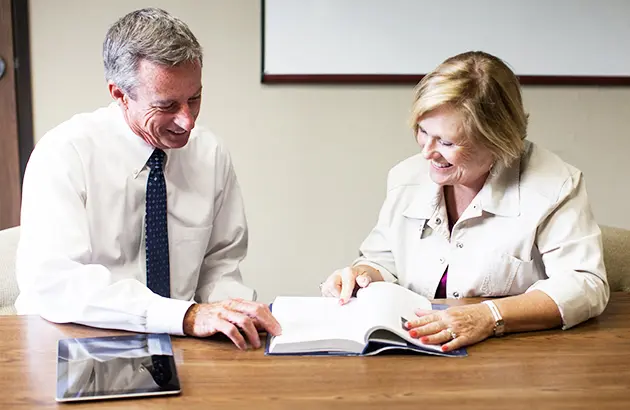 two students reviewing an assignment with a professor